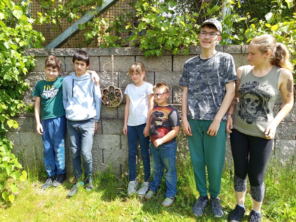 Fotografie zachycují práci dětí na výrobě hmyzího hotelu.
