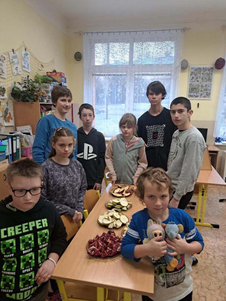 V rámci projektu Ovoce do škol děti ochutnávaly plody z ochutnávkového koše, např. granátové jablko, jablko Gala, mandarinku, hrušku Konference.....